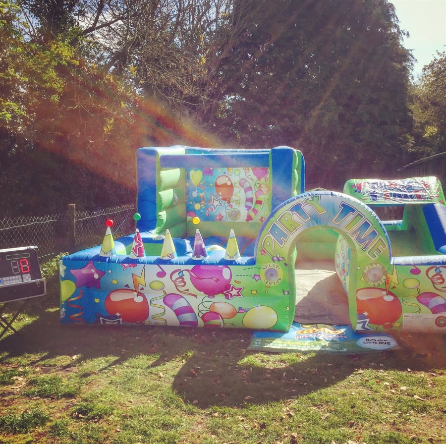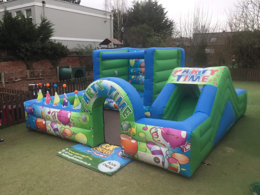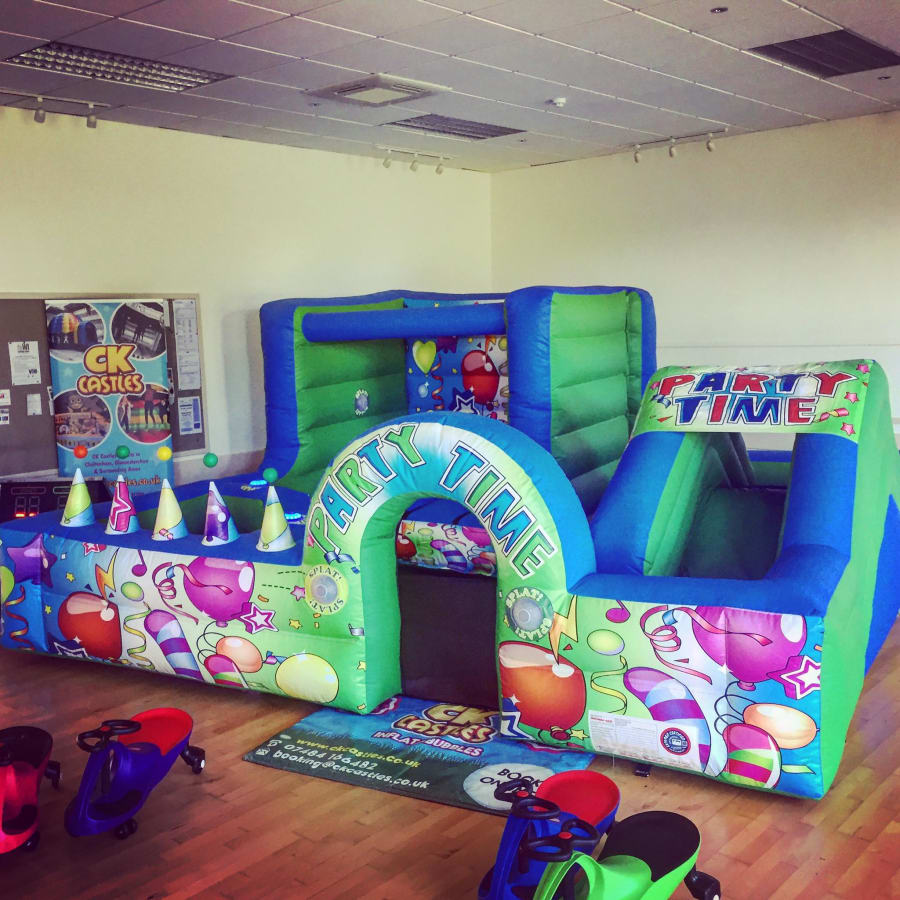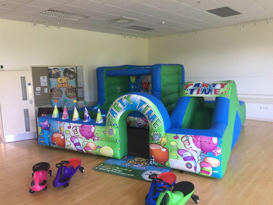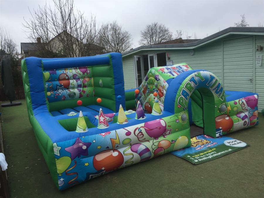 This is a 15x15ft all in one under 5s play centre with a built in bouncy castle, slide, ball pit and air jugglers. This all in one play centre is a neutral party time theme with a light blue and green background colour pictured below.