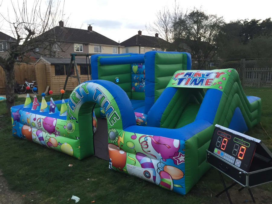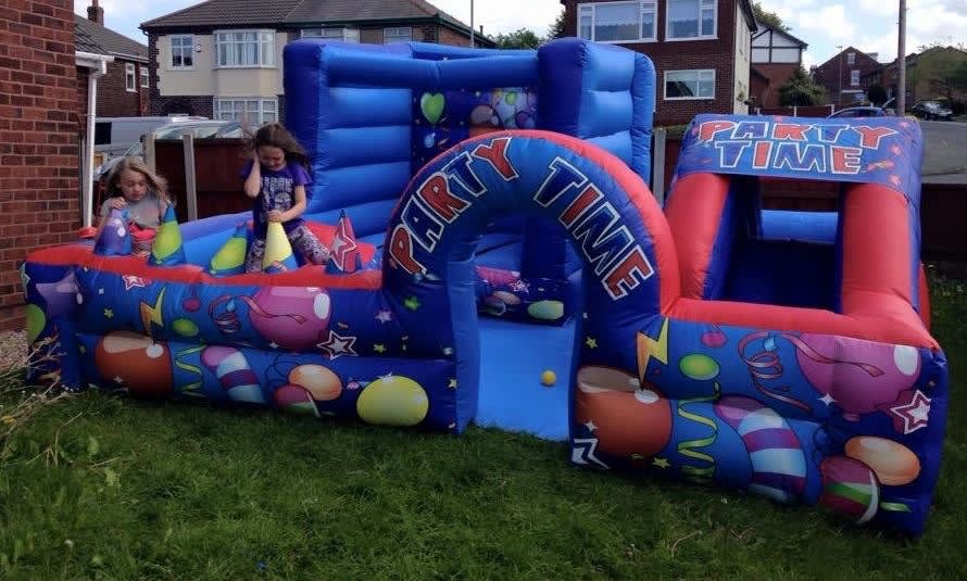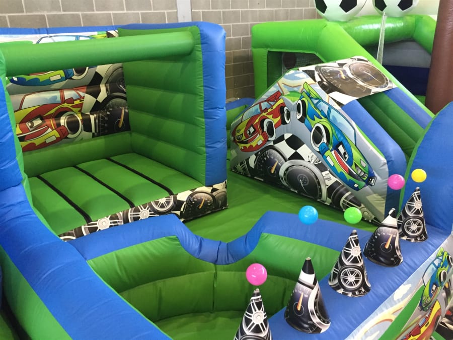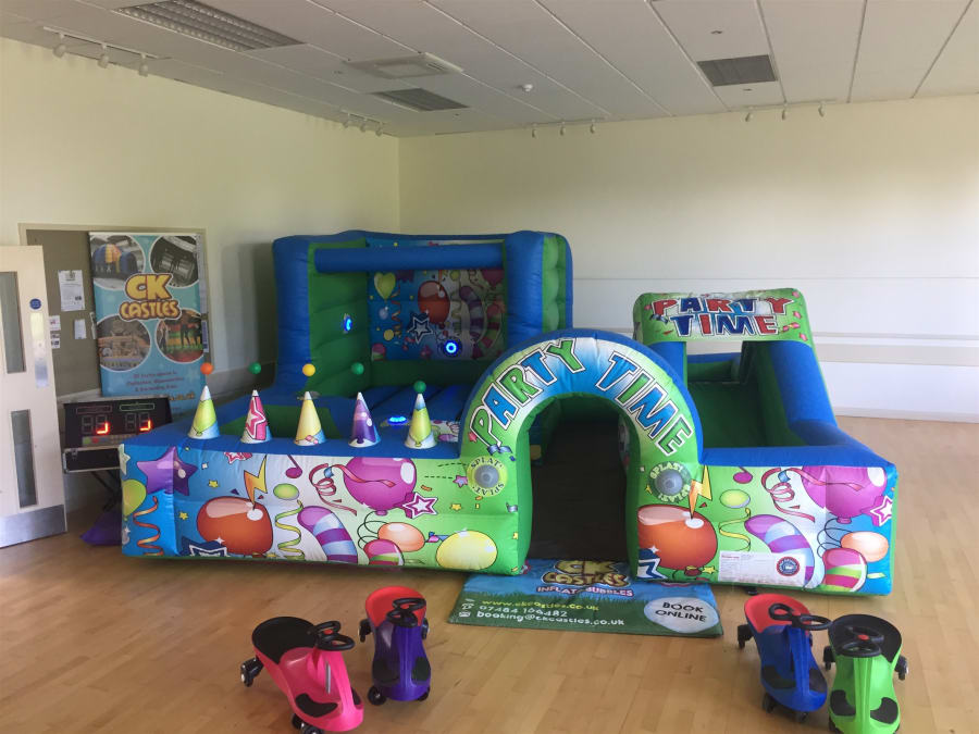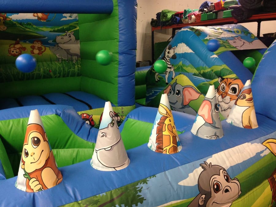 This is a 15x15ft all in one under 5s play centre with a built in bouncy castle, slide, ball pit and air jugglers. This all in one play centre is a neutral party time theme with a light blue and green background colour pictured below.